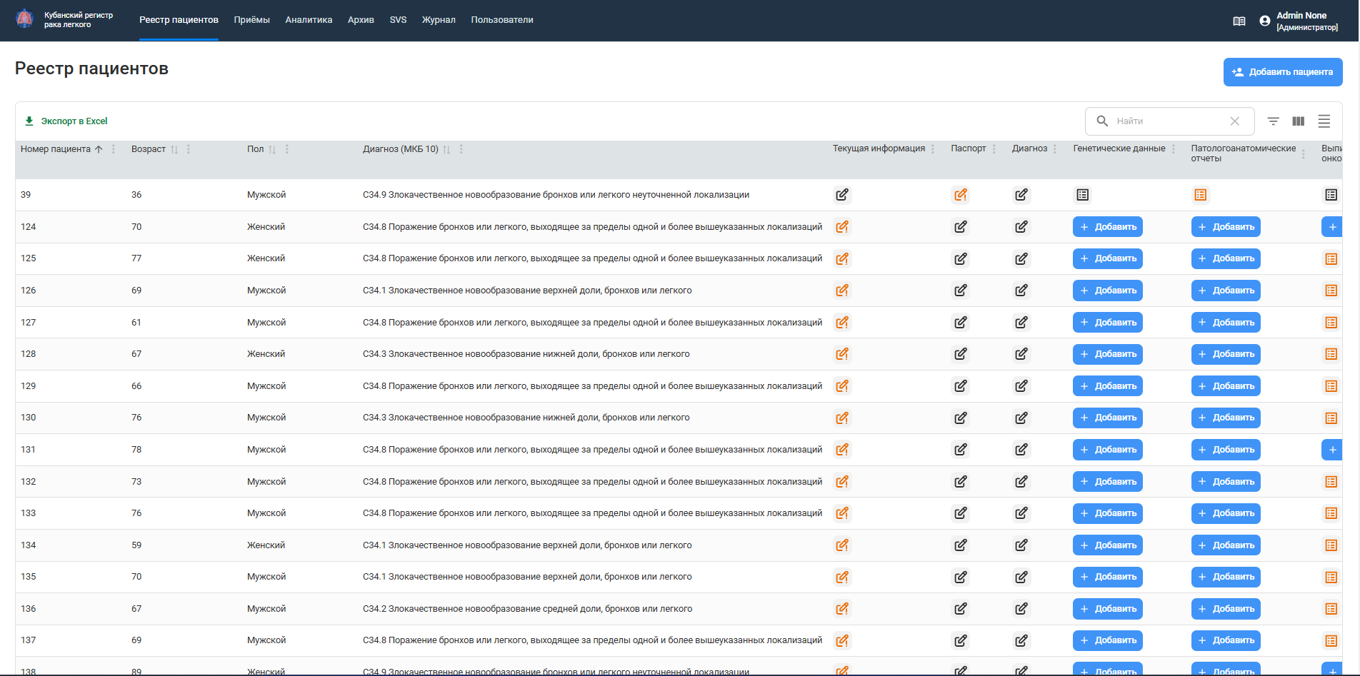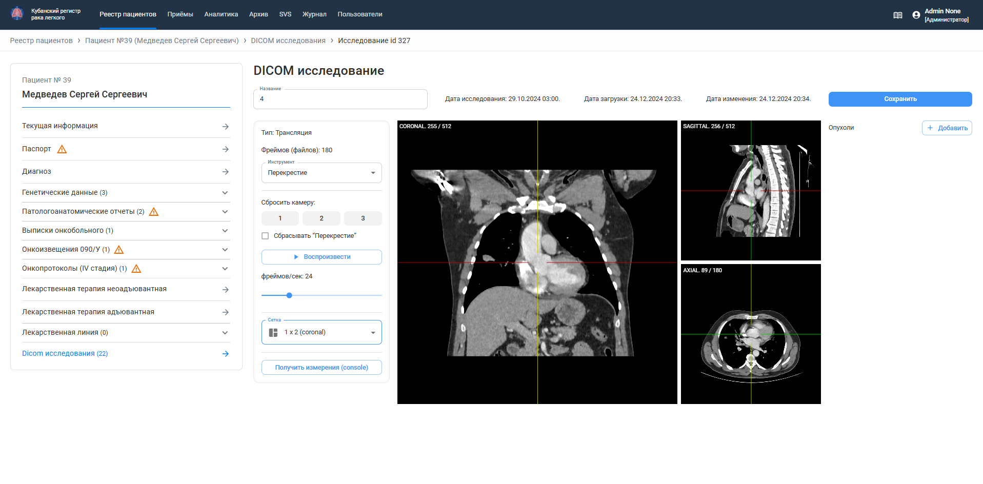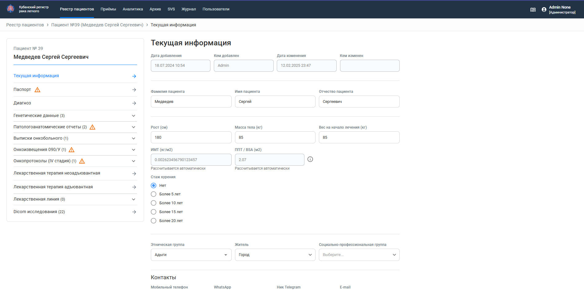 The Oncology Medical Information System serves as a unified data repository for lung cancer, integrating both accounting and analytical functions. The system is designed to enhance oncology data management, ensuring precise structuring, analysis, and reporting. It operates within the Scientific Research Institute - Regional Clinical Hospital No. 1 named after Professor S. V. Ochapovsky in Krasnodar.