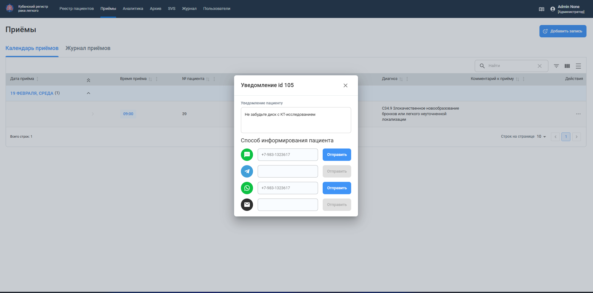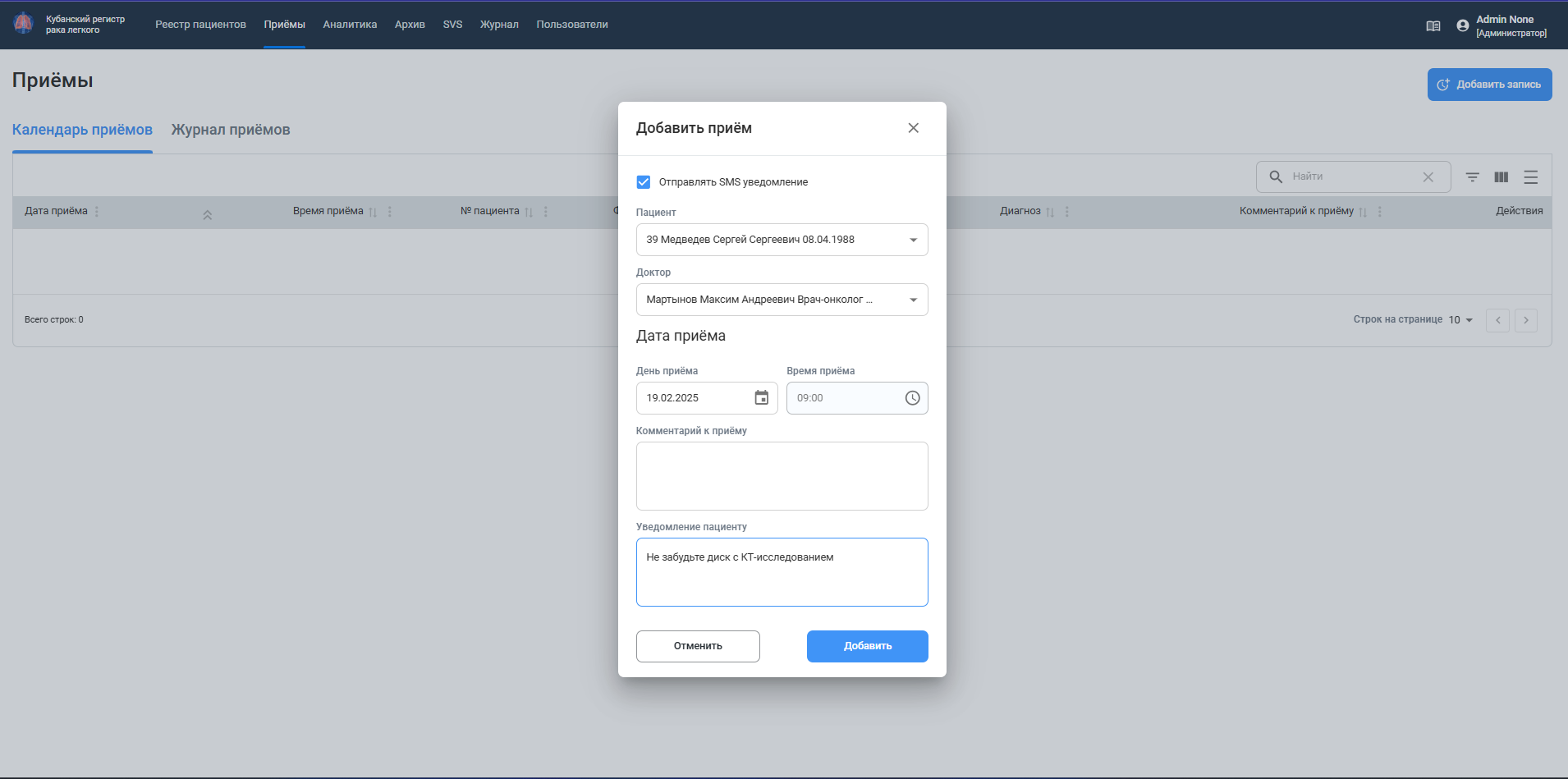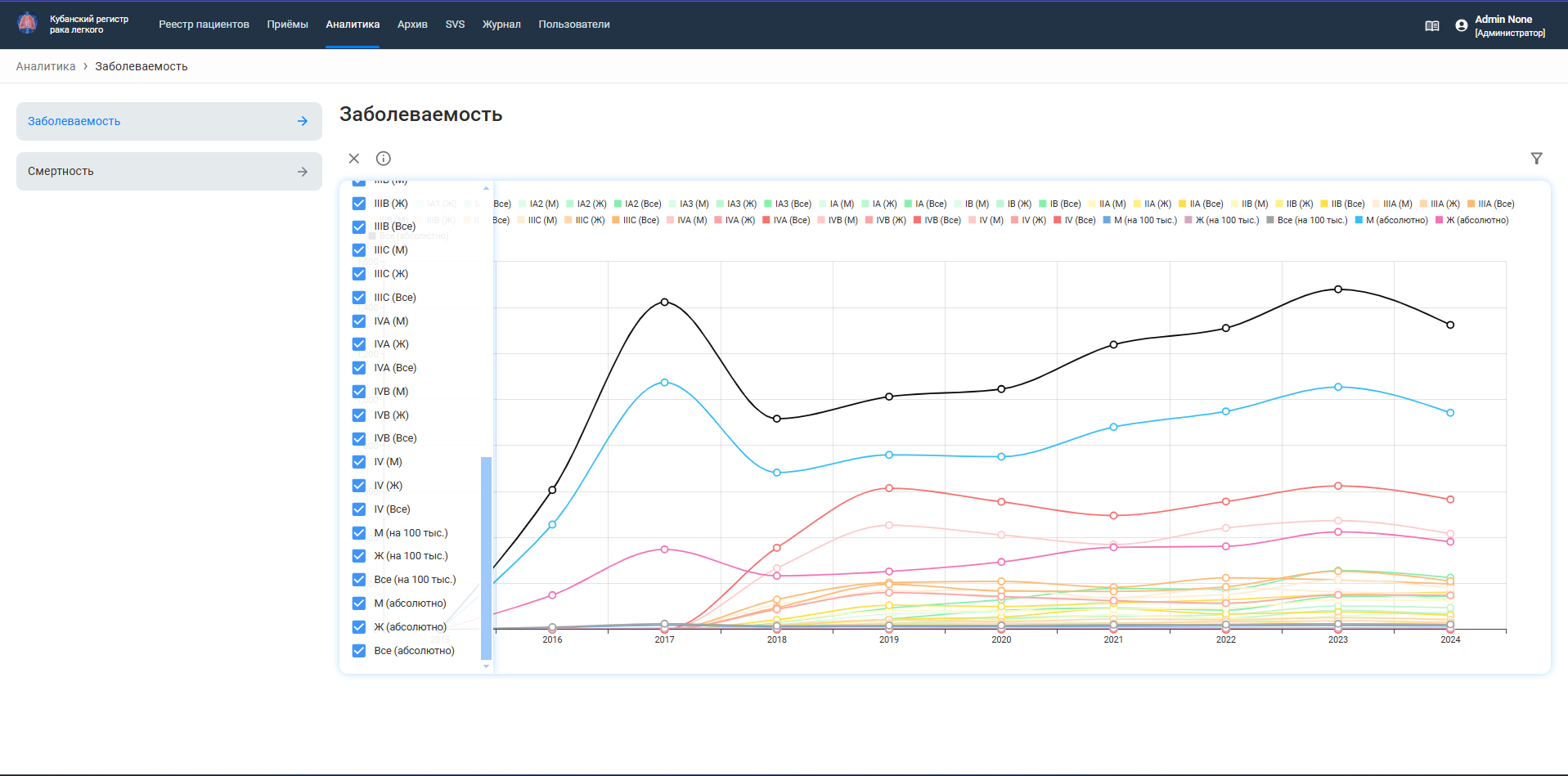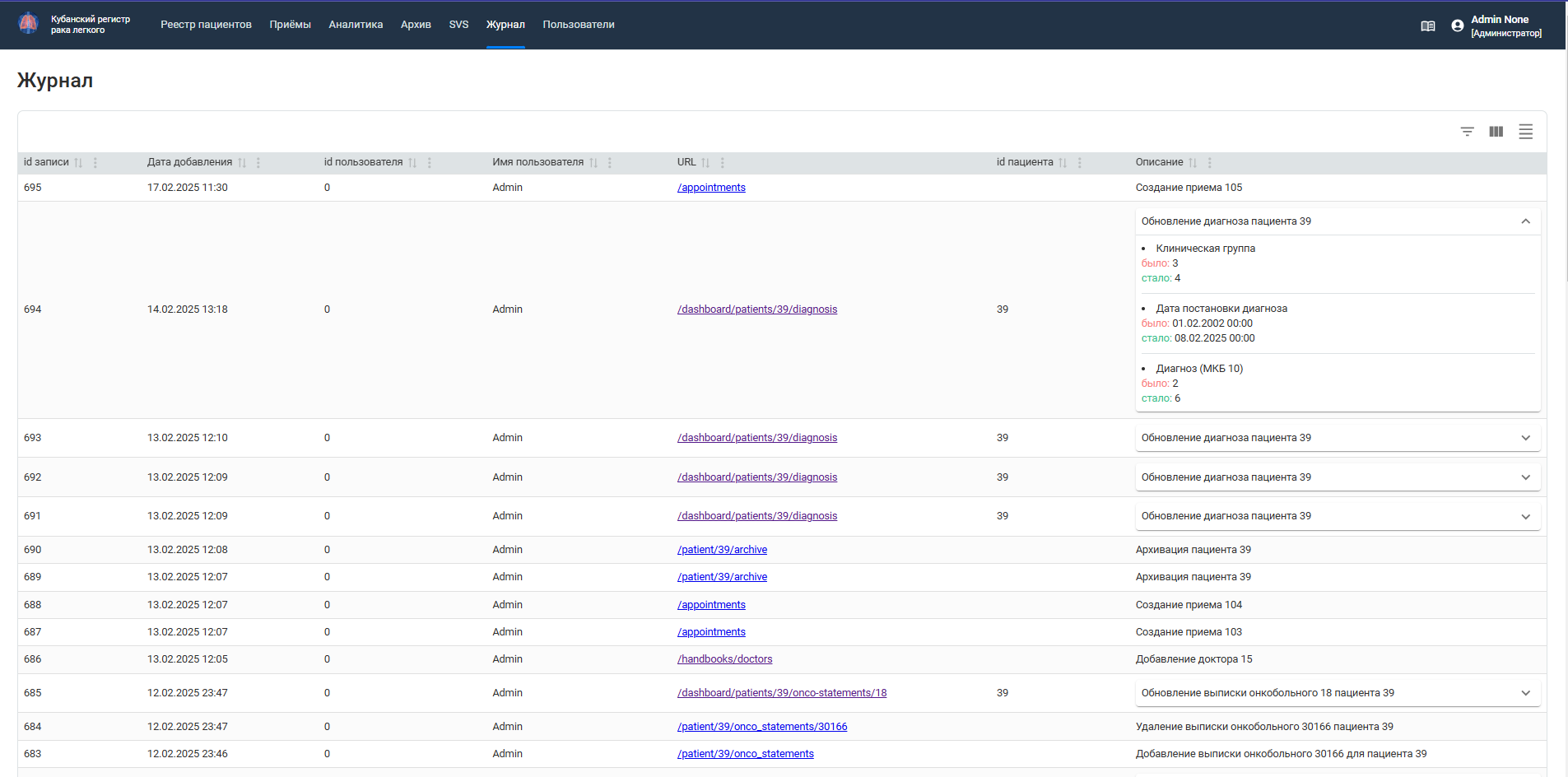 The Oncology Medical Information System serves as a unified data repository for lung cancer, integrating both accounting and analytical functions. The system is designed to enhance oncology data management, ensuring precise structuring, analysis, and reporting. It operates within the Scientific Research Institute - Regional Clinical Hospital No. 1 named after Professor S. V. Ochapovsky in Krasnodar.