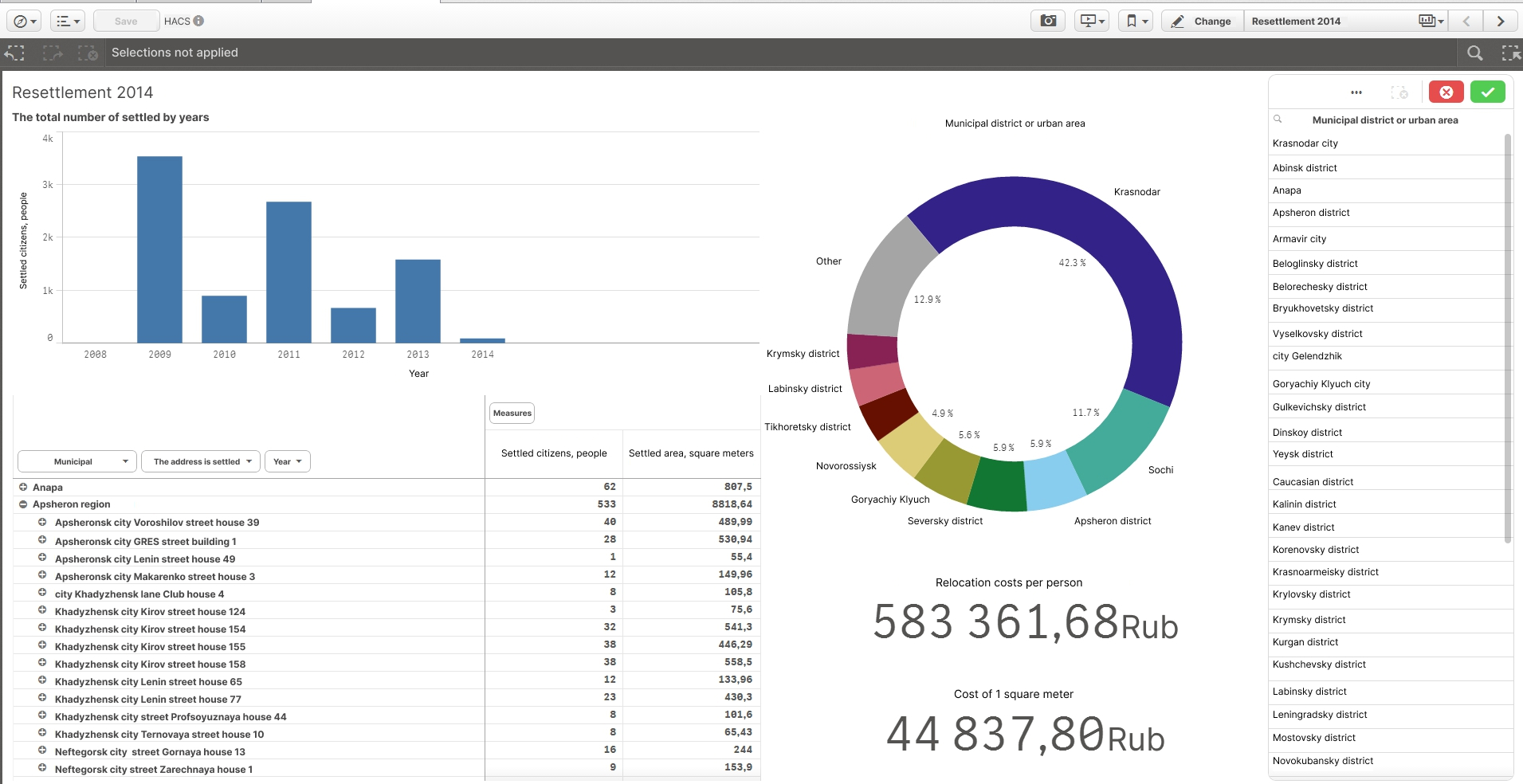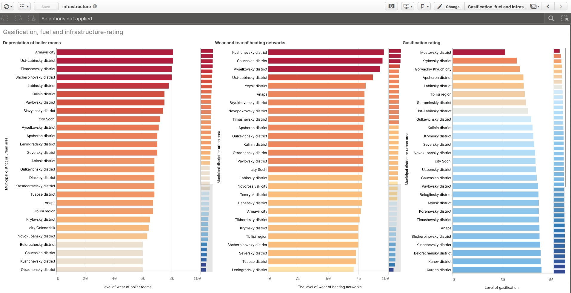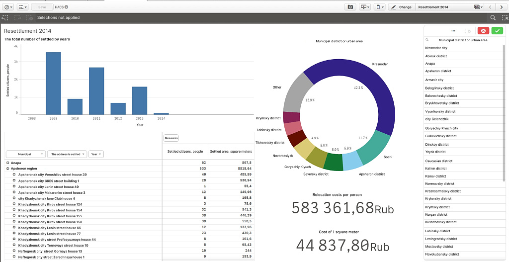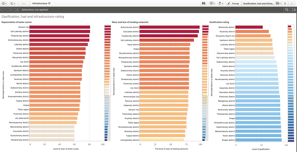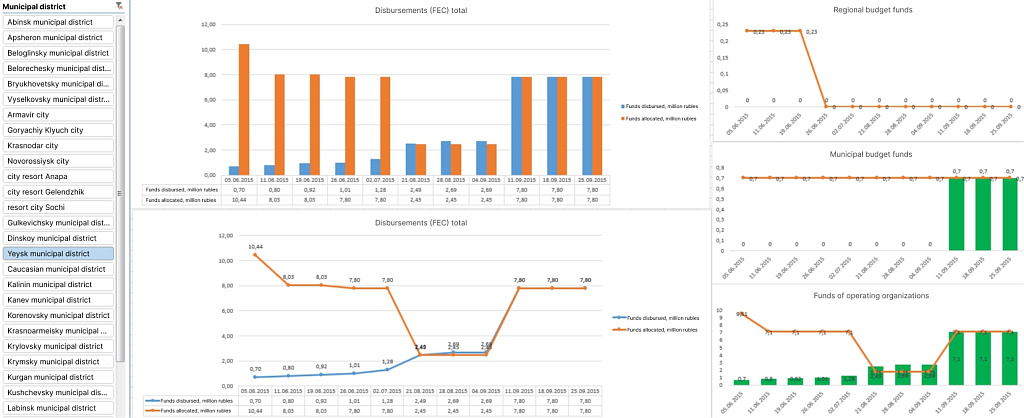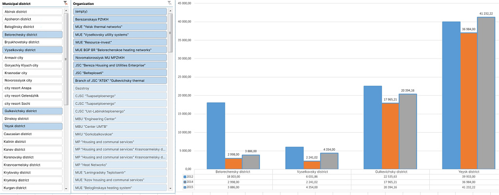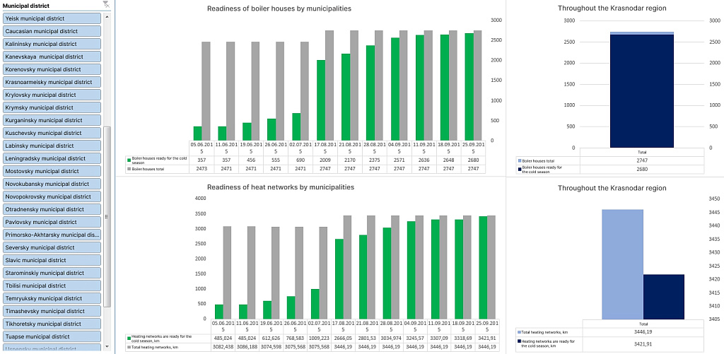 We have created over a dozen interactive dashboards on various fields governed by region authorities. The list includes budget revenues, application of funds, resettlement from dilapidated cost, fuel and energy infrastructure condition, house readiness for the heating season, multi-functional centres efficiency etc.