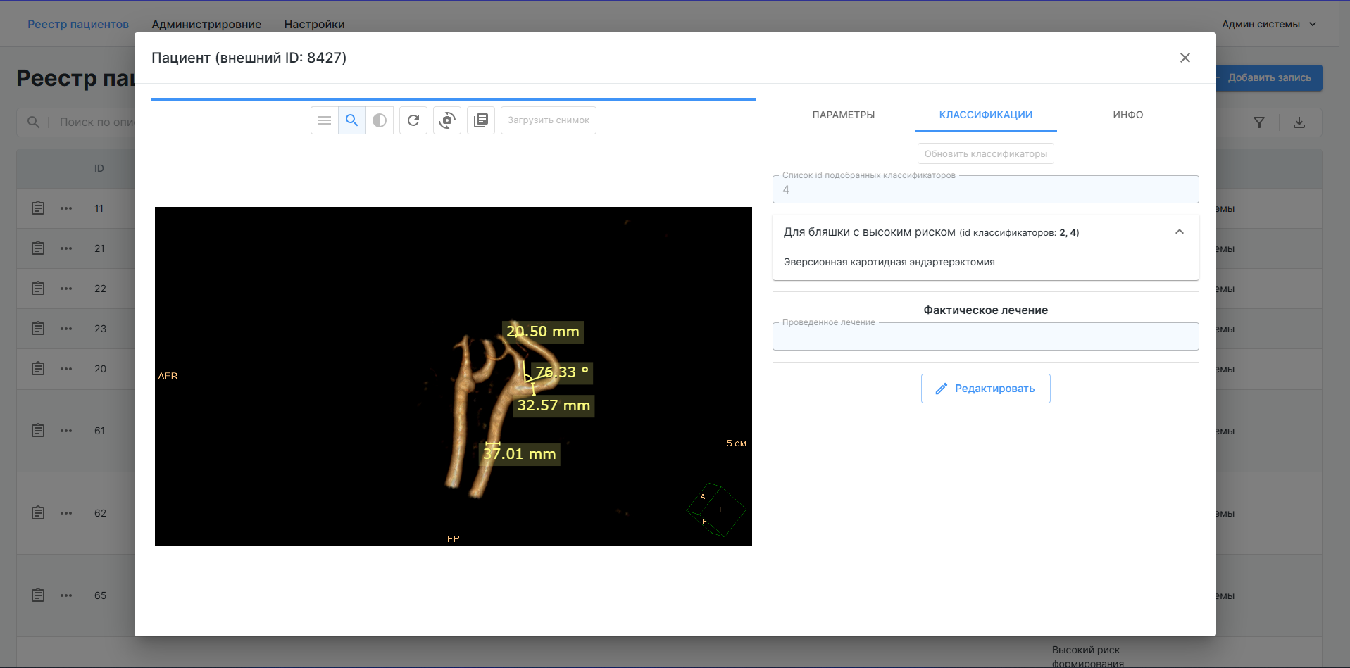 The system is designed to improve the accuracy of vascular diagnostics and streamline patient data management by automating key processes, including measurement, classification, and treatment recommendation generation.